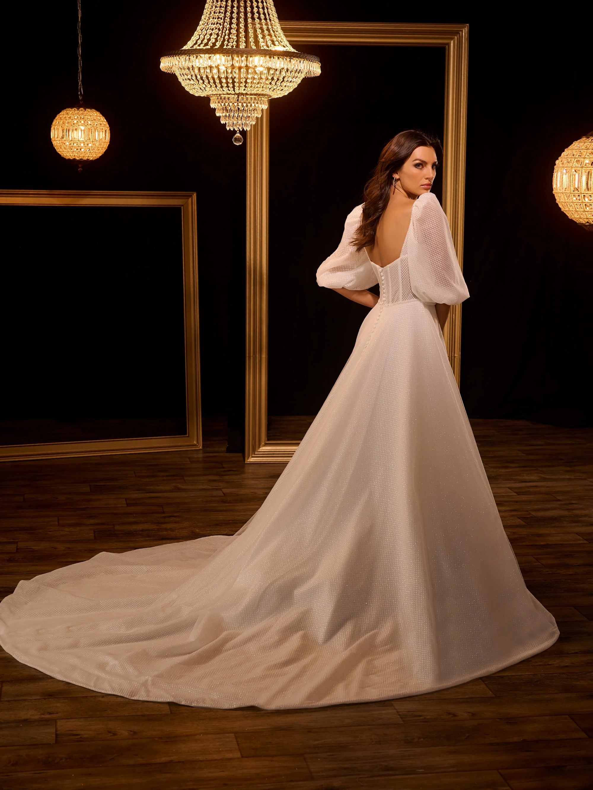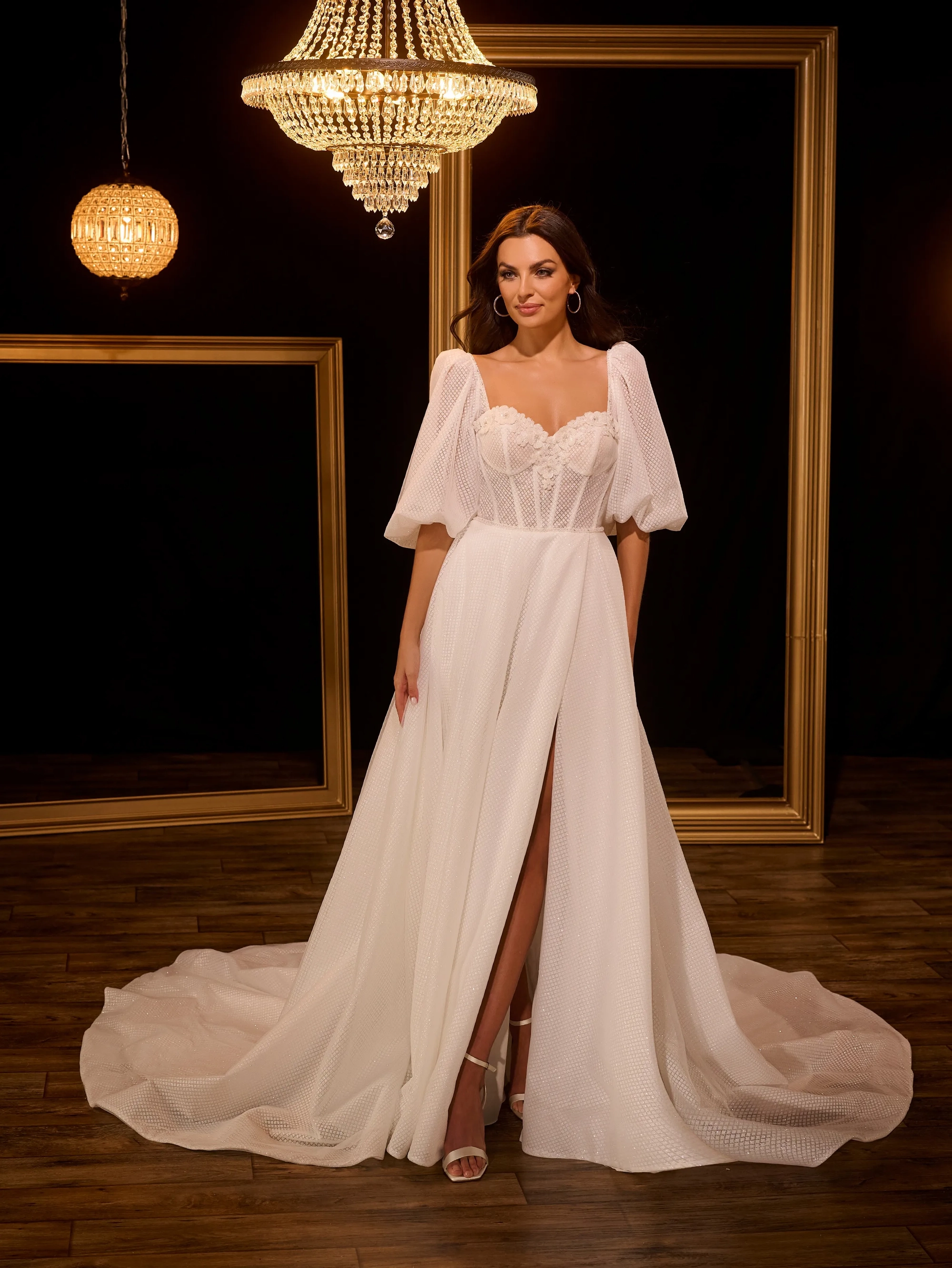 A-line gown with sweetheart neckline and puffy sleeves, split on side skirt.