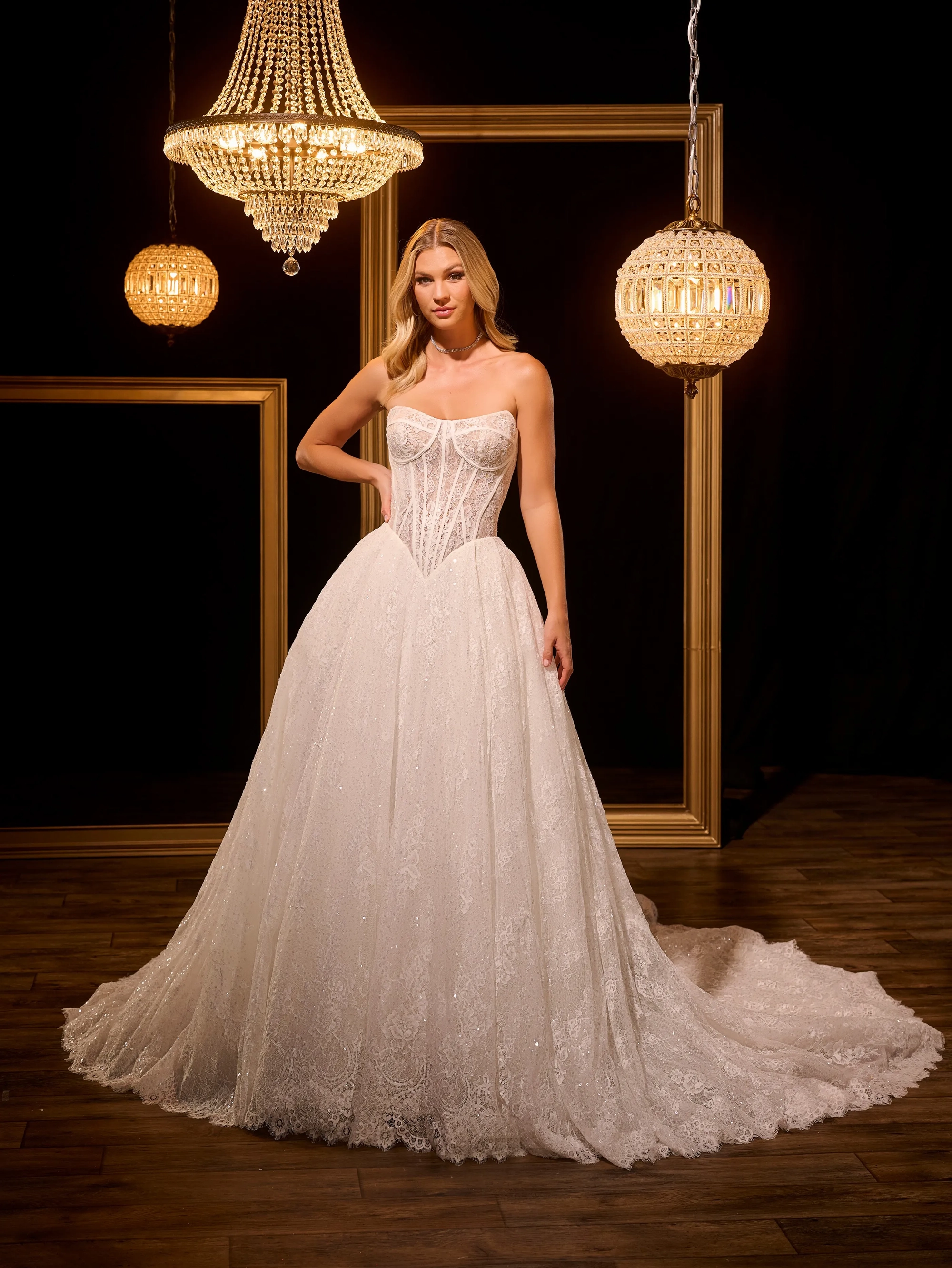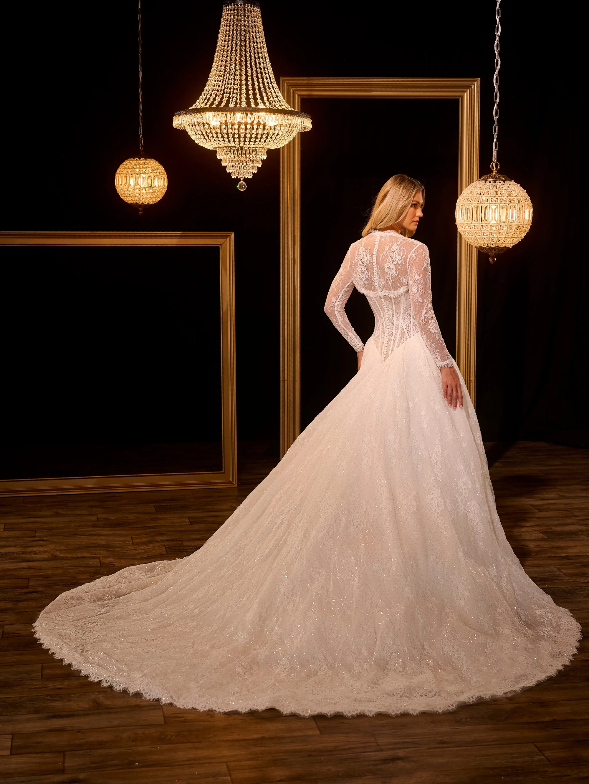 Ball gown in all over chantilly lace with detachable lace bolero. Scooped neckline, buttons/zipper back closure.
