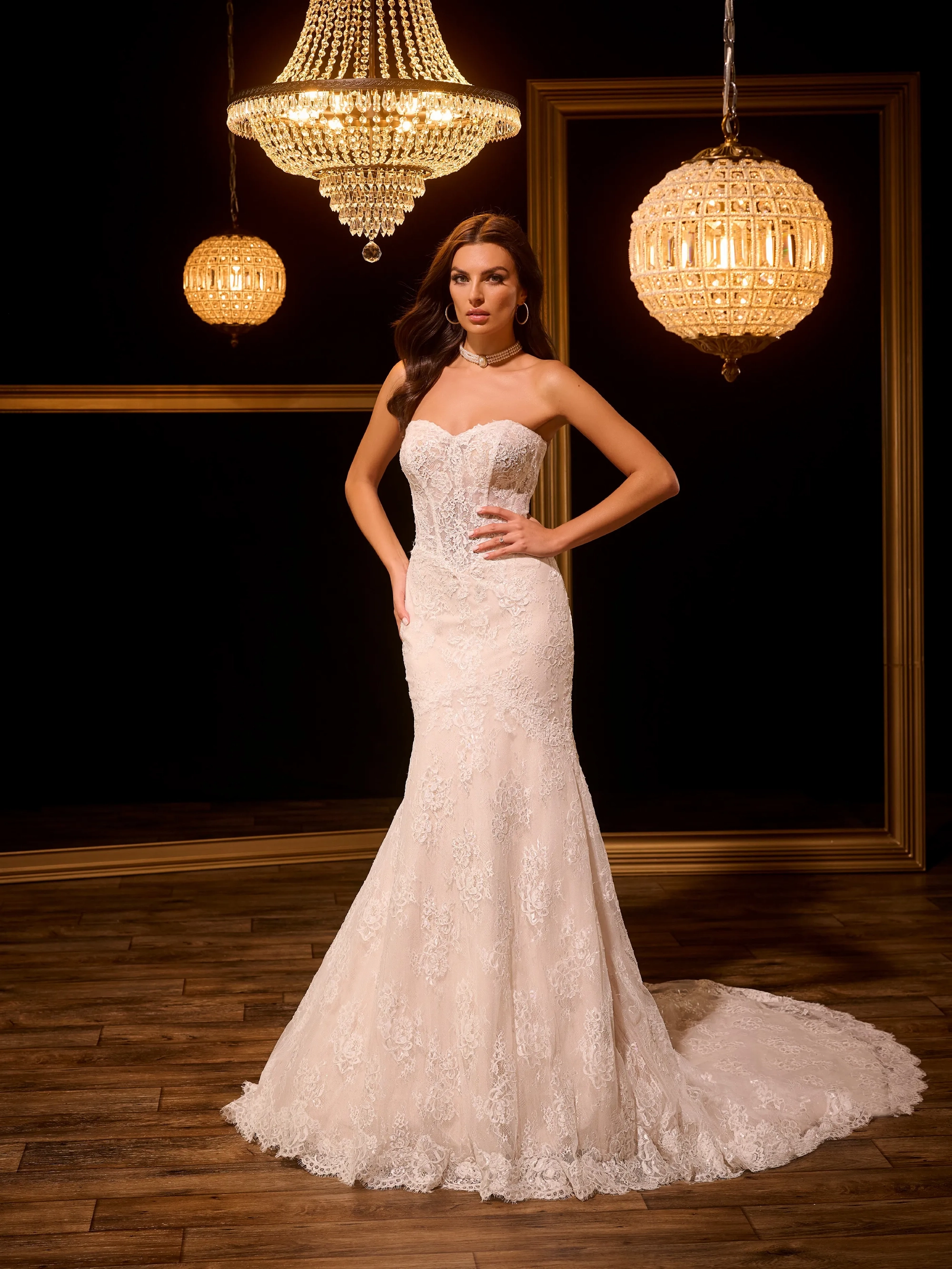 Slim style in all over corded lace with sweetheart neckline. Detachable bolero with high neck. Buttons/zipper back closure.