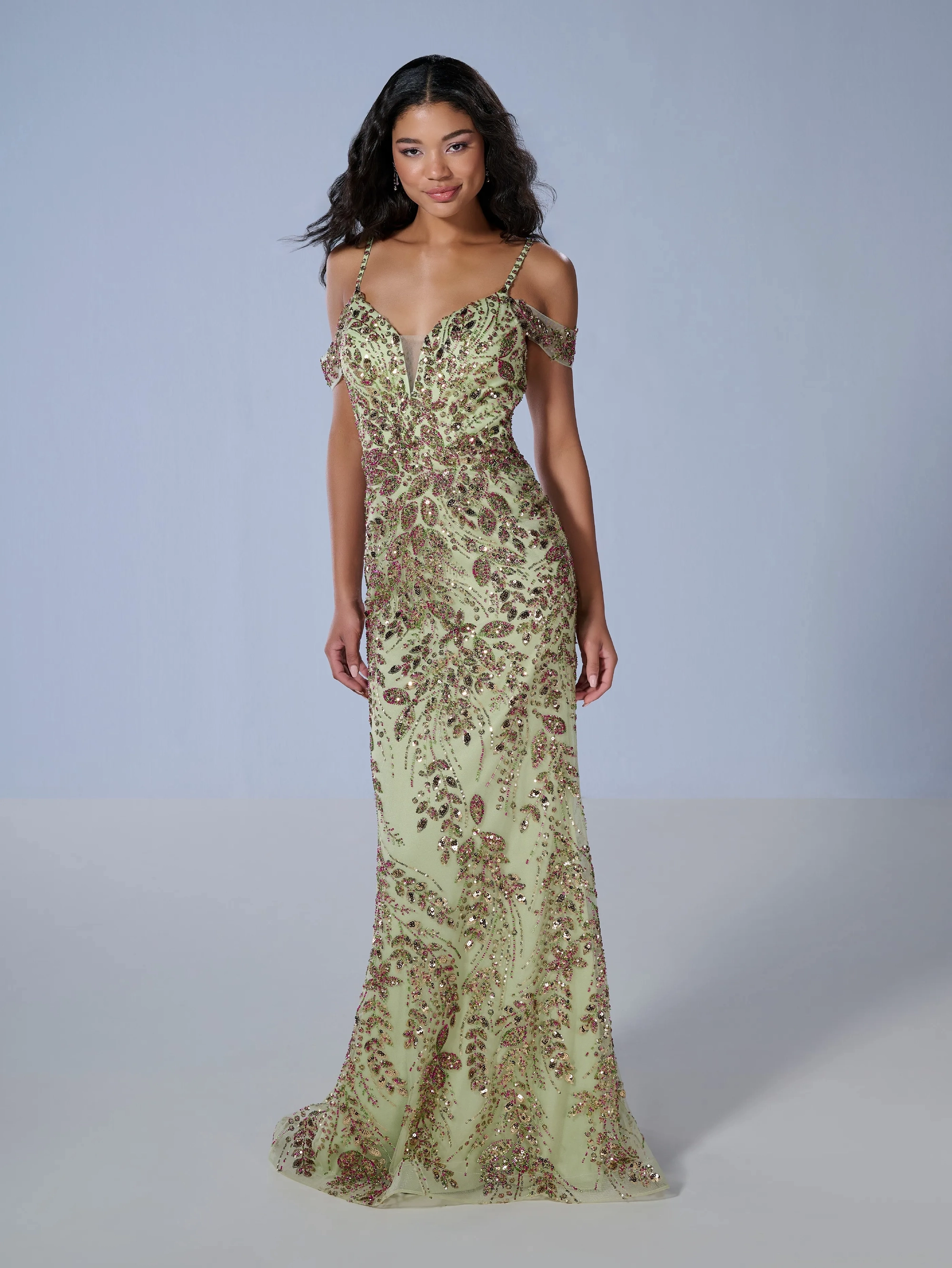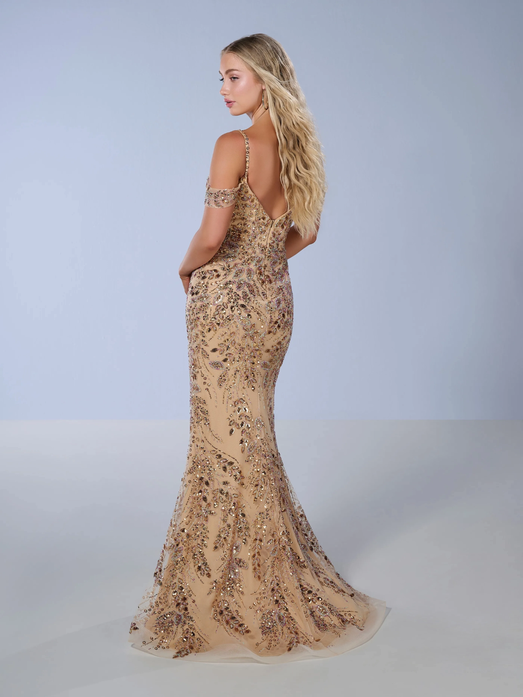 A fit and flare fitted illusion neckline gown made with gold coast beaten mesh fabric. Gown also comes with detachable swag sleeves.